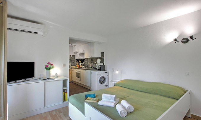 Inside, the apartment’s bright and contemporary characteristics are well complemented by a modern, fully-equipped kitchen with a microwave, Nespresso machine, oven, fridge and microwave, which allows you to conveniently prepare delicious homemade meals and dine in. The apartment also offers access to a washing machine, ironing facilities, private parking and Wi-Fi for convenient longer stays.