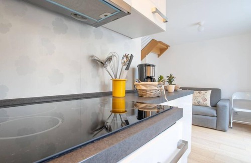 2-room apartment 35 m2 on 3 levels on 1st floor. Bright, beautiful and modern furnishings: living/dining room with panoramic window with air conditioning. Exit to the balcony. Kitchenette (4 induction hot plates, microwave, electric coffee machine). Heating, air-conditioning. Upper floor: gallery with TV (flat screen). 2nd upper floor: gallery with 1 french bed (140 cm, length 190 cm), shower/WC and air conditioning. Small balcony 10 m2. Balcony furniture. Facilities: washing machine, iron, hair dryer. Internet (WiFi, free). Please note: apartment courtyard side. Instead of an enclosed bedroom, some sleeping areas are located in an open-plan area (gallery, alcove, etc.). 06088009695MX