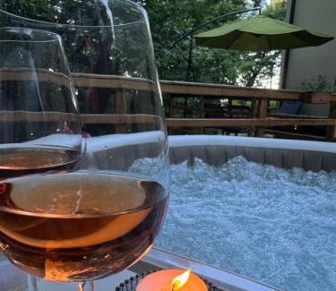 Food & DrinkTea/Coffee maker, Bottle of waterBathroomPrivate bathroom, Hairdryer, Toilet paper, Toilet, Towels, Shared toilet, ShowerGeneralAir conditioning, Iron, Safe, Heating, Ironing facilities, Private entrance, Key access, Hardwood or parquet floors, Trash cansMedia & TechnologyFlat-screen TV, TVActivitiesHot tubOutdoorsBarbecue, Patio, Balcony, Outdoor dining area, Terrace, Outdoor furnitureKitchenWine glasses, Washing machine, Oven, Electric kettle, Kitchenware, Refrigerator, Dining table, Dishwasher, Microwave, Stovetop, Kitchen, Coffee machineLiving AreaSofa, Dining areaBedroomWardrobe or closet, Linens, Childrens' cribsViewGarden viewAccessibilityEntire unit located on ground floorEntertainment & Family ServicesBooks, DVDs or music for children, Board games/puzzlesRoom AmenitiesHypoallergenic pillow, Non-feather pillow, Socket near the bed |