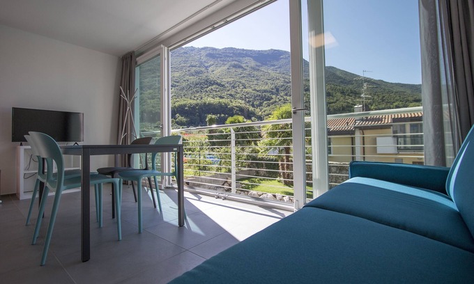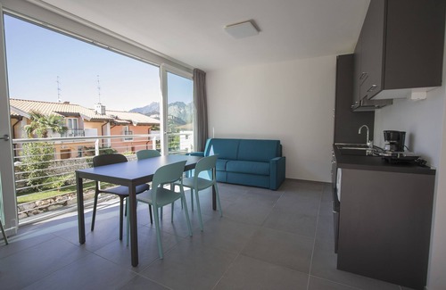 A few steps from the center of Arco and a few minutes from the shores of Lake Garda, in the residential area of Bolognano, in September 2018 this residence was completed where this particular two-room apartment is located.
