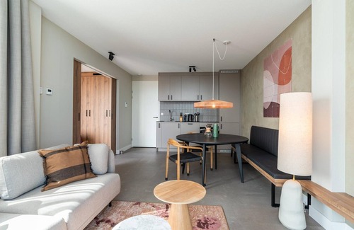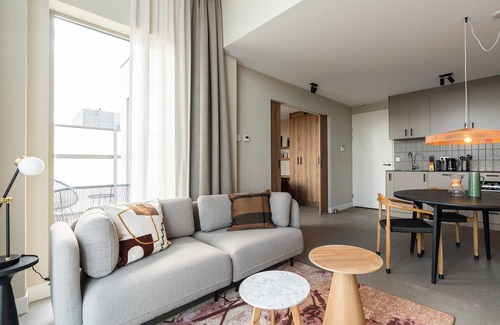 These 1-bedroom apartments, each spanning nearly 60 m², are situated on the fifth, sixth, and seventh floors, offering stunning panoramic views of the city. Designed to accommodate up to 2 guests, these apartments are ideal for both short and long stays. The interior boasts a perfect blend of natural colors, materials, and modern technology, creating an inviting and comfortable atmosphere. The fully equipped kitchen, cozy dining area, and comfortable sofa, along with a large SMART TV with Chromecast, ensure a relaxing environment. The bedroom features a comfortable bed, a second SMART TV with Chromecast, a desk, and ample closet space. The spacious bathroom includes a shower, a sink with drawers, and a heated mirror, while a separate toilet is also available. For added convenience, there is a dedicated laundry room with a washing machine and dryer. Large windows provide breathtaking city views, and on warmer days, guests can enjoy the outdoors on the spacious terrace. The apartment is designed to offer both comfort and functionality, with a strong focus on sustainability, as electricity and heat are primarily generated by solar panels, emphasizing the environmentally friendly features of BizStay Walden. Guests at BizStay Walden enjoy access to a range of amenities, including a welcoming lobby with tea and coffee making facilities and a free fitness room. On-street parking is available for a fee, and private parking can be arranged on request, subject to availability.