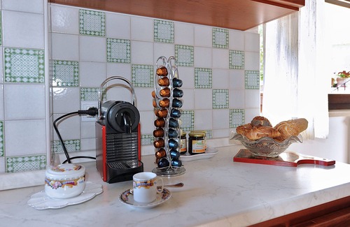 The kitchen, warm and well-equipped, includes an oven, microwave, dishwasher, electric kettle, juicer and an espresso machine, enriched by a moka for those who prefer traditional coffee. As a sign of welcome, you will find delicious coffee pods, ready to be savored.