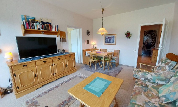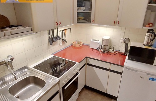 The enclosed kitchen is fully equipped with modern appliances such as a 4-burner electric stove, oven, microwave, refrigerator with freezer, dishes, cutlery, kitchen utensils, toaster, kettle, and coffee maker. A private bathroom with a shower (with bathtub), sink, toilet, and a guest toilet are available. Bed linen, towels, tea towels, bathroom amenities (soap, shampoo, etc.), and a basic supply of consumables are included. A private washing machine, clothes rack, vacuum cleaner, and laundry service make your stay easier.