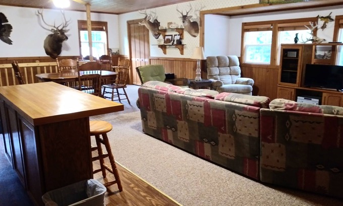 Enjoy lodge style living in our open floor plan apartment near Big Wolf Lake. A wooded walking trail leads to our private boat docks. Boat & kayak rentals are available for exploring the chain of 7 lakes. Picnic tables, fire ring, & gas grill are all available.