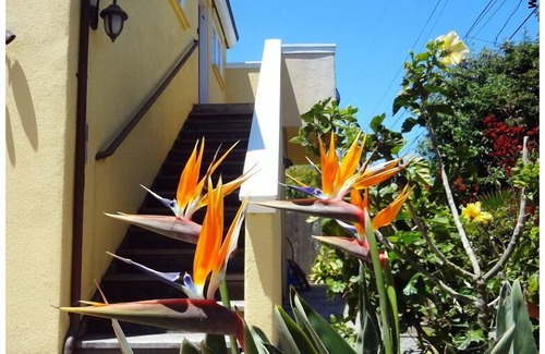 Relax on the sunny deck, walk along West Cliff Drive and fall asleep at night to the sound of crashing waves. Cowells Surfside is a clean, one- bedroom apartment located two houses from West Cliff, behind a main house and above the detached garage. Surrounded by plants and a garden it has beautiful views of the Monterey Bay, Boardwalk, Santa Cruz Wharf and Santa Cruz Mountains. The apartment has bamboo floors, granite counters and large sunny windows. The living room has a pullout sleeper sofa making space for children or additional guests. There are plenty of linens and towels along with a stocked kitchen. Included with your stay are two beach cruisers, boogie boards and beach chairs. The deck has a working gas grill for outdoor cooking. It’s a perfect get away for a couple of small family.