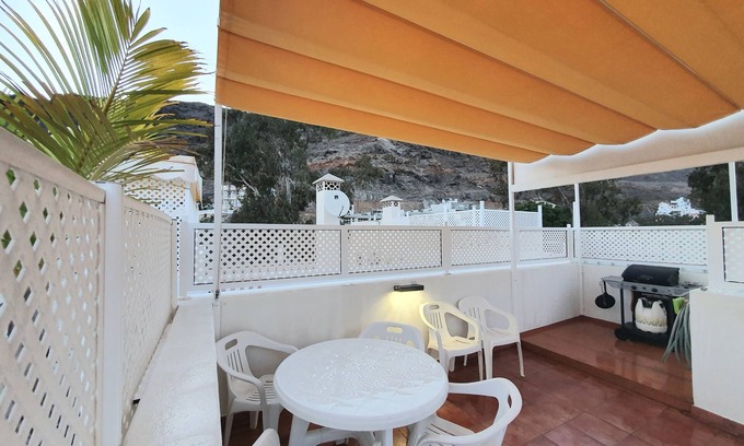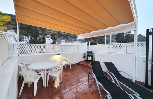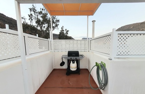 The apartment is located inside a building for residential use. It consists of 2 bedrooms both with private bathroom, fitted wardrobes, air conditioning and heating, ceiling fan. Kitchen living room (oven, microwave, kettle, coffee maker and cooking utensils). The living room has a flat Smart TV, there is free wifi in all the house. Coquettish terrace with dining table for 4 people, washing machine and incredible views of the mogán beach area. The house has a private solarium (with gas barbecue, solar shower, awning, hammocks and dining table) located in the attic of the building accessible only by stairs.