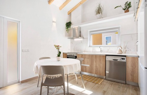 On the mezzanine, you will find a bedroom with a double bed, chest of drawers, wardrobe, and a work area. The living room has a sofa bed suitable for 1 adult or 2 small children. The private, fully equipped kitchen is integrated in an open space with the living room and includes a dishwasher, induction hob, extractor fan, electric oven, microwave, fridge-freezer, washing machine, water heater, hand blender, electric kettle, toaster, coffee machine, electric grill, and kitchen utensils. You have access to Wi-Fi, a fan, and a flat-screen TV with streaming services. The spacious bathroom features a Portuguese-style shower accessible for wheelchairs, toiletries, hairdryer, towel heater, and bidet shower.