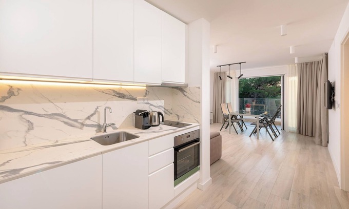Take a refreshing dip and advantage of sunny days by the Outdoor pool. No crowds, no fixed mealtimes and no overcrowded terraces - awake your inner chef using available Grill and indulge in delicious local food. Fill your evenings with lots of laughter and fun whilst sipping local drink(s) on 10 m2 balcony. Kick-off your day by relaxing in 80 m2 garden. Nice little added bonus is view of Green area and garden.