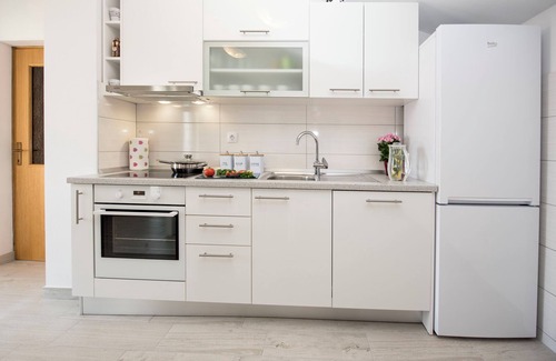 Accommodation Family Spacious offers space up to 5 guests. The picture perfect nature and pebble beach and larger rock fragments beaches are 1500 m away. Share the photos of your well-deserved vacation using Internet available for your use. No crowds, no fixed mealtimes and no overcrowded terraces - awake your inner chef using available Grill and indulge in delicious local food. Refresh and unwind on 16 m2 terrace we are sure you’ll love. Nice little added bonus is view of Garden and quiet street.