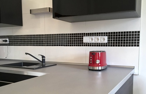 It has 1 bedroom with double bed and extra TV, fully equipped open kitchen with breakfast bar, dishwasher, ceramic hob and microwave, fridge, toaster and kettle.