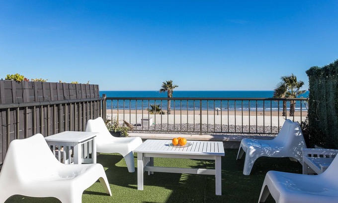 - Impressive terrace with beautiful views of the beach of La Patacona. It has a large living space with a table surrounded by chairs and some sun loungers.