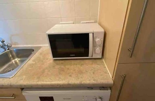 The kitchen has a fridge, a hob, an oven, a kettle, a freezer and a microwave.
