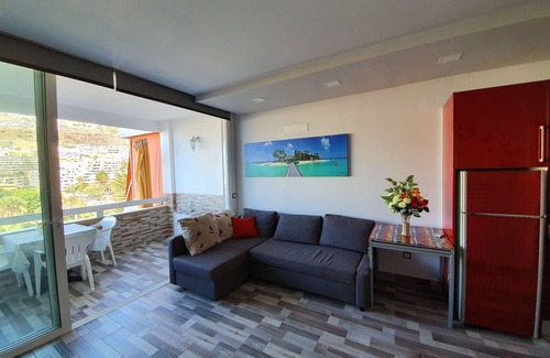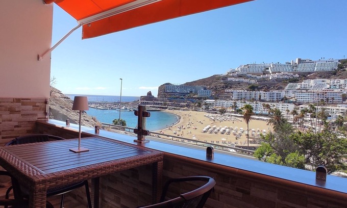 Terrace with table and chairs for romantic dinners overlooking the beach and the marina. The island and the beaches can also be used in the middle of winter for its climate among the best in the world as Wikipidia writes, on average 27/30 degrees all year round. The apartment is located in Puerto Rico of Gran Canaria on the first line of the sea, it has been completely renovated to new in all, it is very welcoming and functional, bathroom with spacious shower cubicle, bed linen and towels available for guests, a large double bedroom that can be changed into 2 single beds, with wardrobe. Sofa that can be transformed into a comfortable double bed. The airport is easily accessible.