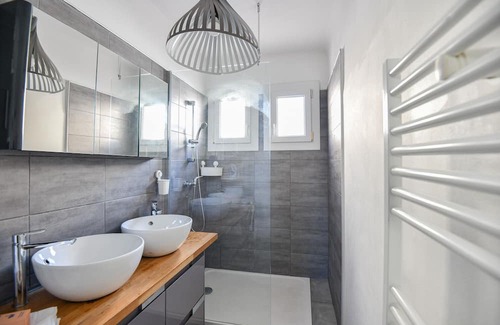 La salle de bain est équipée d'une douche à l'italienne, d'un meuble double vasque. WC séparé.