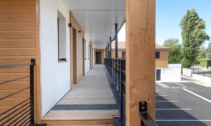 Appart Hôtel Coraline - Genas Lyon Eurexpo offers 30 air-conditioned accommodations, which are accessible via exterior corridors and feature espresso makers and complimentary bottled water. These individually decorated and furnished accommodations include desks. Beds feature premium bedding. Kitchenettes offer refrigerators, stovetops, microwaves, and separate dining areas. Bathrooms include showers with rainfall showerheads, complimentary toiletries, and hair dryers.