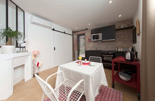 Appart Hôtel Eugénie suggests 4 apartments : you are autonom and you have all advantages of the hotel. Each apartment has its own style. A living space larger than a bedroom in an hotel. Dedicated areas (Sleep, meal, work and living room). A full equiped kitchen for preparing delicious meals. Expresso and tea are at your disposal.