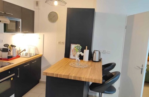 The 1BR apartment has a living room with a comfortable sofa bed for 2 people, a designer bedroom with a cozy double bed for 2 people, and a fully equipped American kitchen with everything you need. for your delicious little dishes, a bathroom with bath and bath towels, a toilet, a balcony offering a beautiful view, and access to the collective swimming pool of the residence, in short everything you need you to have a 5-star stay. In addition, you have the possibility to do your laundry directly in the apartment. So no more excuses and questions before finalizing your reservation. :)