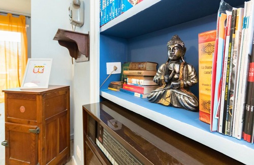 The apartment is accessed from the garden, on a small hallway that leads to the open space living room coming with a TV, a sofa bed and a well-equipped open-plan kitchen decorated in shades of blue and orange, also fitted with a coffee machine, a dishwasher, a toaster, a juicer and a kettle. The living room leads to the bedroom, equipped with a comfortable queen size bed, a large wardrobe, a TV and a desk. The bathroom with hydromassage shower, toilet and hairdryer completes the apartment.