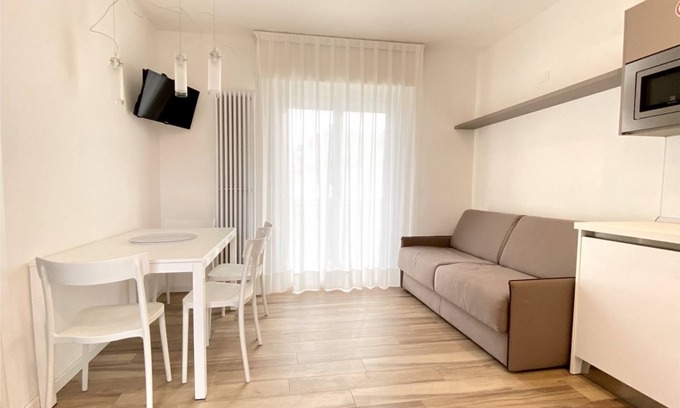 Family apartments- Apartment in the central area of Jesolo between Piazza Brescia and Piazza Mazzini, 50 meters from the beach with a private pedestrian access in front of the house. The apartment is located on the ground floor with a private terrace and has a bedroom with a double bed and a sofa bed in the living room.