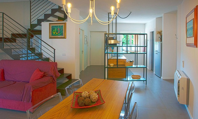 The apartment develops over two levels. On the ground floor you find a living area furnished with designer furniture and finished with details of great taste and elegance. There is a dining corner, a sitting area with a TV for family evenings and a kitchenette equipped with all the most modern appliances. Finally a large bathroom with shower.