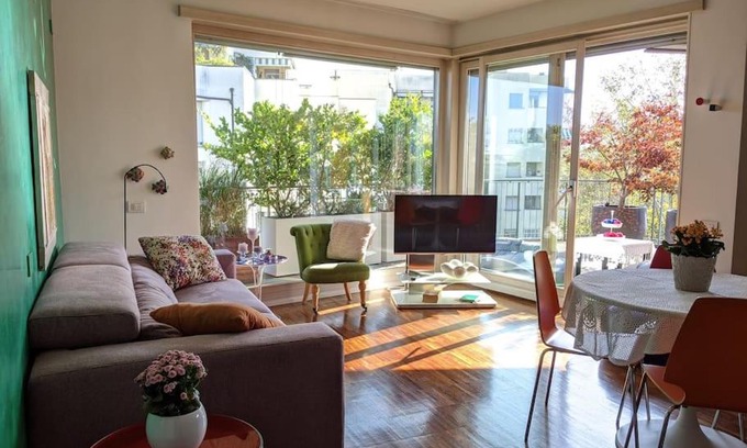 Food & DrinkBottle of water, Tea/Coffee makerMedia & TechnologyFlat-screen TV, TV, Cable channels, Satellite channels, Streaming service (like Netflix)GeneralHardwood or parquet floors, Smoke Alarm, Ironing facilities, Air conditioning, Fire extinguisher, Heating, Carbon monoxide detector, Iron, Private entranceBathroomHairdryer, Body soap, Private bathroom, Bathrobe, Free toiletries, Toilet paper, Bidet, Shampoo, Towels, Bathtub or showerKitchenElectric kettle, Cleaning products, Dining table, Toaster, Kitchen, Washing machine, Wine glasses, Oven, Stovetop, Coffee machine, Kitchenware, Dishwasher, Microwave, Kitchenette, RefrigeratorOutdoorsTerrace, Balcony, Outdoor dining area, PatioLiving AreaSofa, Desk, Dining areaBedroomWardrobe or closet, Walk-in closet, Linens, Childrens' cribsViewView, Garden view, Inner courtyard viewAccessibilityAccessible by elevator, Upper floors accessible by elevatorBuilding CharacteristicsPrivate apartment in buildingRoom AmenitiesFeather pillow, Drying rack for clothing, Adapter, Non-feather pillow, Socket near the bedEntertainment & Family ServicesBaby safety gatesPhysical distancingSingle-room AC for guest accommodationCleanliness & disinfectionHand sanitizer |