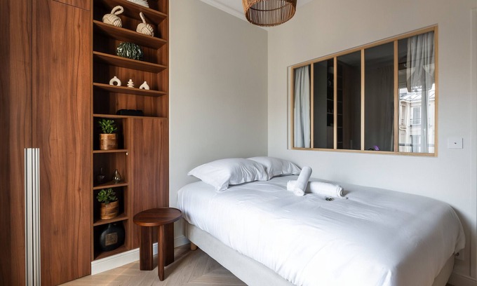 Discover this quiet, bright apartment, with a pleasant garden view from the 5th floor (with elevator), in the heart of downtown Paris.