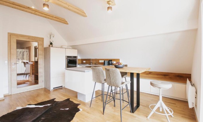 BathroomShower, Toilet, Walk-in shower, Towels/Sheets (extra fee), Private bathroomMedia & TechnologyFlat-screen TV, TVOutdoorsBalcony, BarbecueKitchenElectric kettle, Oven, Coffee machine, Kitchenware, Dishwasher, Dining table, Stovetop, Wine glasses, Refrigerator, KitchenLiving AreaDesk, Sofa, Sitting area, Dining areaGeneralHeating, Trash cans, Private entrance, Key access, Hardwood or parquet floors, LockersViewInner courtyard view, Garden view, View, Mountain viewBedroomWardrobe or closetAccessibilityUpper floors accessible by stairs onlyBuilding CharacteristicsPrivate apartment in buildingRoom AmenitiesSocket near the bed |