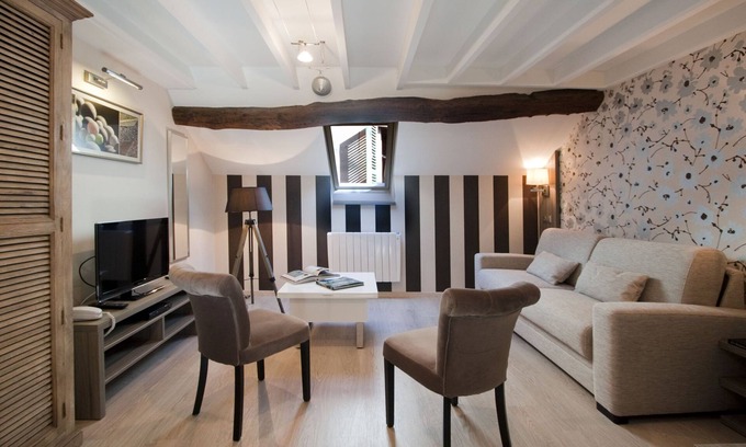 Le Romanée: a fully-equipped duplex flat on the 1st floor. It includes a small living room with a sofa bed, a fully equipped kitchenette, a bathroom and a bedroom upstairs.