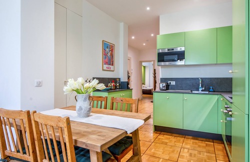 - a well-equipped open kitchen (coffee machine, toaster, coffee machine, oven, microwave, fridge, freezer, cooking plates, dishwasher),