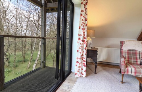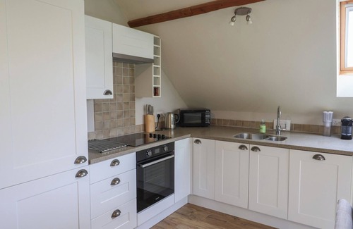 Apple Loft, a first floor apartment, consists of a studio-style living space including a king-size bed with freestanding bath, kitchen with electric oven and hob, fridge/freezer, microwave, dishwasher, and coffee maker, a dining area with seating for two guests, and a sitting area with Smart TV, electric fire, and balcony. There is a shower room with walk-in shower. WiFi, fuel, power, bed linen, and towels inc. in rent. Outside, there is a balcony with furniture and off-road parking on-site. EV charging point (type two untethered). Sorry, no pets and no smoking. Return year after year to Apple Loft. Within 2.4 miles you will find a shop and 3 miles a pub. Note: Apple Loft is unsuitable for babies, children, and dogs. No smoking inside or on balcony. Note: Steps down from patio to lawn, please take care. Note: Minimum 2 nights stand-alone guest suite available for flexibility - 90 GBP for 2 nights, 120 GBP for 3 nights, 150 GBP for 4, 5, 6 or 7 nights - please contact for availability.