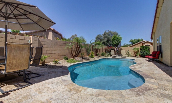 Just three minutes off the I10 and twenty-five minutes from Phoenix International Airport. Located in Canyon Trails a safe, quiet, family friendly neighborhood (even a covered kids playground one block away). The backyard is a south facing oasis of relaxing pleasure with endless sunshine, an amazing pool with (heating available at a cost of $150p/wk) great seating areas, within a desert garden paradise.
