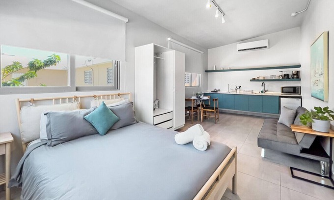 - **Studio Layout**: A plush queen bed and a sofa that can sleep one.