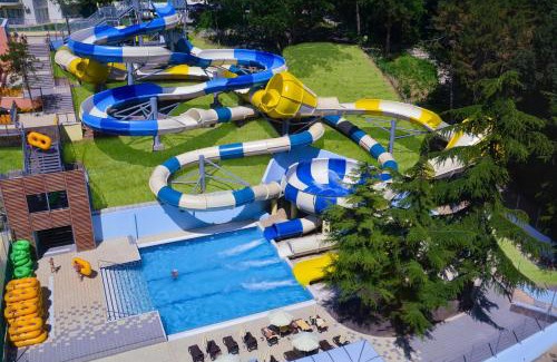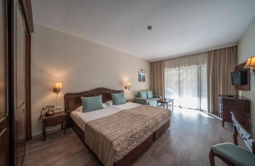 The Grifid Club Hotel Bolero & Aqua Park – Ultra All Inclusive enjoys a great location in a quiet area of Golden Sands and just a few yards away from the sandy beach, offering plenty of facilities and dining options. Grifid Club Hotel Bolero & Aqua Park – Ultra All Inclusive offers a private beach with 1 parasol and 2 sun beds with mattresses per room available free of charge. The Ultra all-inclusive offer consists of breakfast, late breakfast, lunch, afternoon snack and dinner. Free local and imported alcoholic beverages, soft drinks, coffee and tea are served at 3 different bars. Upon minimum stay-4 nights- А-la-carte restaurants (Asian, Bulgarian,Fish and Italian). A Grifid Dine Around complimentary dinner choice of a-la-carte restaurants is offered in Grifid Vistamar and in Metropol, upon reservation. Smart Casual: shorts are permitted except swimming trunks, beach attire, flip flops and sleeveless shirts. The modern complex provides pillow menu and tastefully furnished rooms with free of charge safe and Wi-Fi, most of them looking to the pool side. The hotel also features a free of charge 8,000 square-yards aqua park with an adult and a children section. If you like sports, there are also a tennis court, a multi-purpose sports pitch for volleyball and basketball, waterpolo, aqua-gym, bicycle tours, air riffle shooting, dancing lessons. Unwind in the relax center of the Grifid Club Hotel Bolero & Aqua Park – Ultra All Inclusive with a sauna, steam bath and massages or beauty treatments at a surcharge. A children's mini club in the shape of a pirate ship, an outdoor veranda, mini disco, a playground with a professional children animator and program for teenagers with different sport activities are also at guest's disposal. A Grifid Dine Around complimentary dinner choice of a-la-carte restaurants is offered in Grifid Vistamar and in Metropol, upon reservation and minimum stay of 4 nights