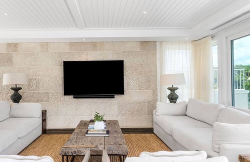 -Sophisticated and stylish interior with lots of organic textures- including limestone and wood floors, linen and sandstone walls