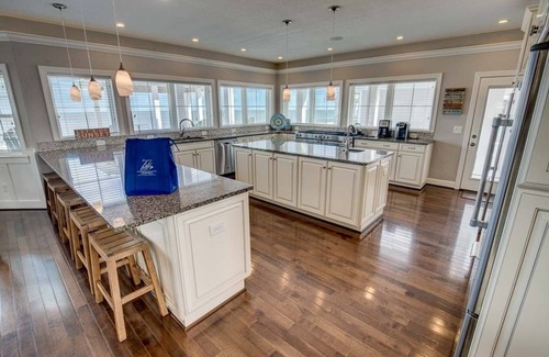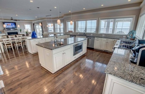 Wow! Another fabulous oceanfront property by local experts in luxury construction! “Aquatic Dreams” is set apart by a distinctive floor plan with living space on the mid-level and bedrooms on the top level. No worries about the view because the great room and kitchen now span the entire ocean side and panoramic views make even cooking for 29 a pleasure! There is a huge kitchen compared to most rental properties. A large center island with another sink makes it easy to fit plenty of help for meal preparation, all while enjoying the great ocean view. The deck has a covered cabana with table for meals, drinks and hanging out overlooking the pool and ocean. Quality furnishings will entice you to spend most of your time outside…winding down and relaxing with the family.