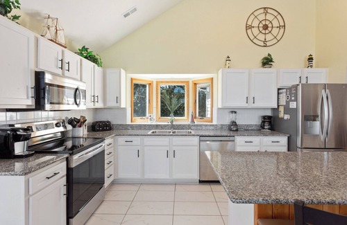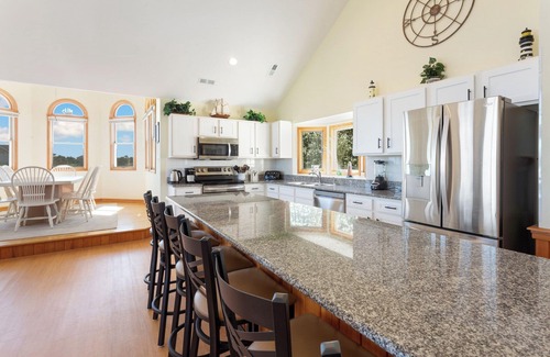 The Top Level holds the spacious great room, equipped with ocean views from the sun deck and Crow's Nest! The dining area offers seating for 8 and additional seating for 4 at the breakfast table. If that's not enough, have the kids hop over to the kitchen with additional bar seating for six. The top-level King Bedroom has access to the spacious sun deck. There's also a convenient semi-private bath with entry points from the Living Area and King Bedroom.