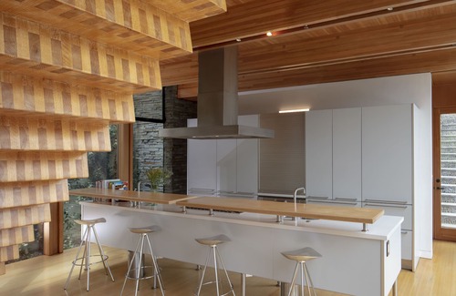 The hip Bulthaup kitchen features Gaggenau and Subzero appliances, including a five-burner gas range and a wine fridge. Two sinks and two dishwashers make for easy cleanup, while a coffee maker will help kickstart the day. Gather for meals at the six-person dining table, or at the kitchen bar for four.