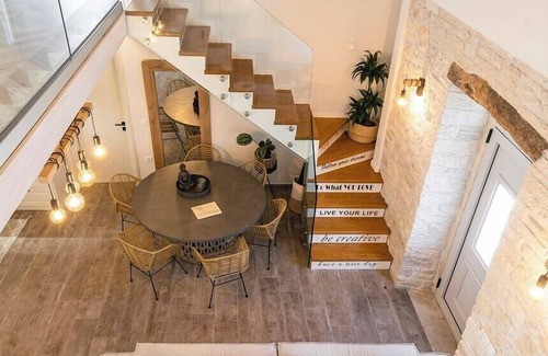 The main entrance leads into a convivial open-plan space, part of which has double height ceilings. Light coloured wooden beams are reflected in the flooring, soft grey exposed stone walls add warmth, and a palette of greys, whites and browns brings a sense of tranquillity and harmony.