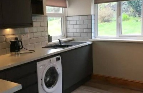 The kitchen is equipped with dishwasher and washing machine with rotary line and airer rack for drying.