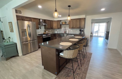 You'll love the expansive family room, and combo open kitchen/dining, both lively spaces for everyone to hang out. The sleek, modern kitchen is fully equipped. When you're ready to recharge, retreat to the large primary bedroom, complete with a plush king-sized bed and a spa-like en-suite with double sinks and a custom shower. The queen size bedrooms are located on opposite sides of the home from the main bedroom, giving plenty of private space for traveling couples and friends.