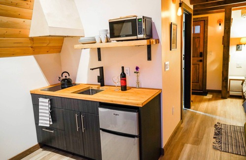 The kitchenette is fully equipped with a mini fridge/freezer, microwave, cooktop, kettle, French press coffee maker, and dishware, making it perfect for light meals or snacks. The luxurious bathroom includes a modern vanity and a soothing waterfall shower. Step outside to your private patio, complete with outdoor seating and a table, or take a soak in the outdoor tub surrounded by privacy curtains for a truly serene experience. For an elevated stay, the cabin features a private outdoor soaking tub with privacy curtain and backyard patio with seating, perfect for morning coffee or stargazing.
