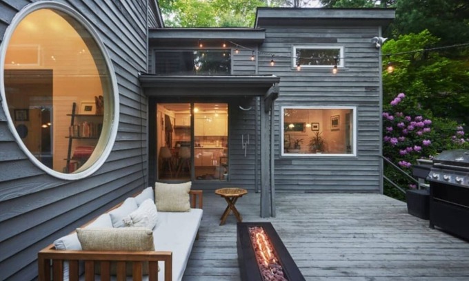 One of the best parts of the house is the front porch, which is surrounded by gorgeous rhododendron bushes. Here, you can relax and unwind in the cozy, private nook, which features a propane fireplace and tons of string lights, making it the perfect spot to enjoy the warmer days and evenings.
