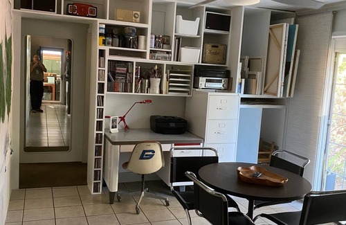 We have two places to hang out in the living area. A small sofa with a chair along with a dining table surrounded by 4 vintage Eames fiberglass chairs. There is a third hangout/dining area next to the kitchen, which doubles as my studio. It has a round Eames table with 4 MR side chairs. this room also has a desk should you need a place to work on your laptop.