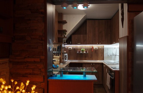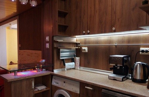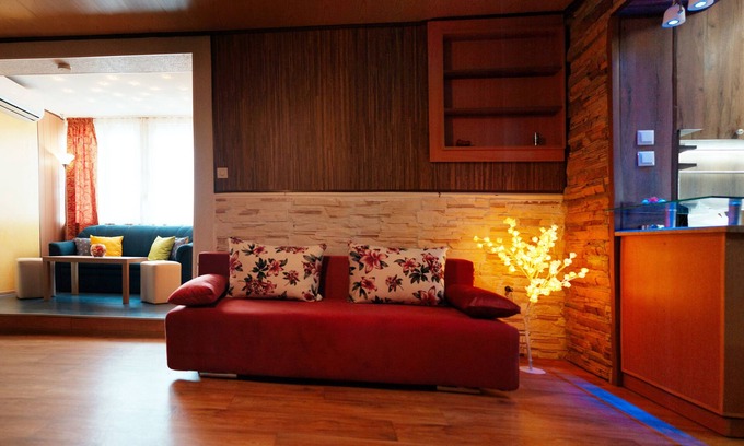 The apartment has one double bed and two sofa beds for 4 people (optional up to 6). The kitchen has all the needed apliances - fridge, oven, coffee machine, microwave, stove, dish washer, toster, washing machine. Flat 55`TV in the living room, 40`TV in the bedroom, Wi-Fi and AC in every room. The apartment is decorated with stylish stone applications and light effects that you will enjoy.