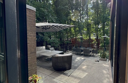 The outdoors offers full privacy and peace, with outdoor dining and lounging furniture, tall trees, and kind neighbors. For the colder months there are two tall standing heaters at your disposal and a useful heated driveway for safe garage access.