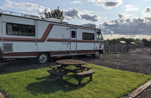 This fun and quirky RV is parked on a beautiful and quiet campsite in North Lincolnshire's countryside with its own garden area and picnic table. With full access to campsite facilities combined with local attractions and pubs this mobile home makes for a great get away.