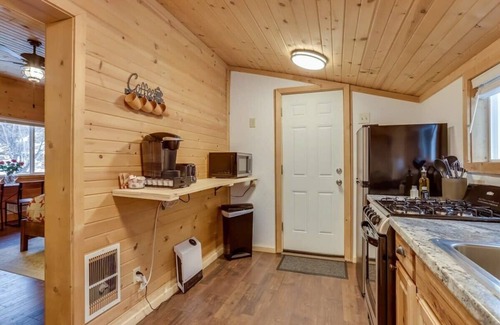 Walk from the main area to the kitchen where you will find a refrigerator, gas stove/oven, toaster, microwave, coffee and all the cookware and dishes you need! Enjoy a small dining table set for two in the main living area. If you prefer to grill you can walk out the back door to your own private fenced in patio to enjoy some grilling and fresh mountain air! You will see the hummingbirds are everywhere up here and on a clear night the view of the night sky is spectacular! Fall asleep at night to the sound of the river!