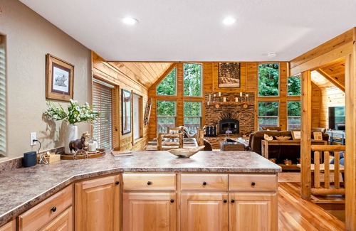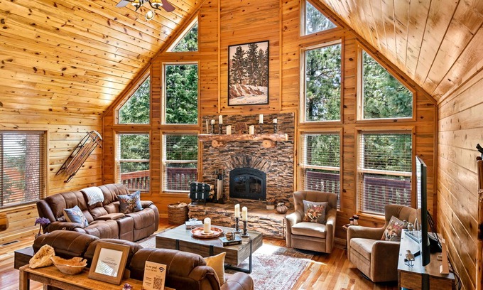 ~ Our living room is an oasis of tranquility with its serene views of lush pine trees, a charming stone fireplace, and a Smart TV that opens up a world of entertainment, from Netflix, Hulu, Prime, Disney Plus, HBO to your other favorite streaming subscriptions.