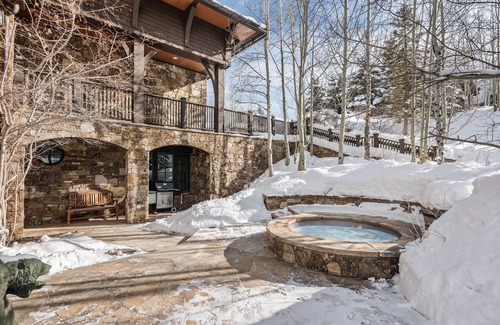 This handsome stone and wood duplex, designed by famed architect Robert Stern, a two-minute walk to the ski lifts, has a magnificent private yard with great outdoor entertaining features – a secluded outdoor dining area (use it also in the winter with supplied propane heaters), expansive cocktail patio and grill area, and an elegant stone hot tub, perfect for relaxing after a heavy day of skiing, hiking , biking. Indoors a two-story living room, stone fireplace, and elevator connecting all four floors. Sleeps six adults in the top floor three bedrooms; two bunk-beds and a fold-out sofa in the rec room with large screen TV and separate full bath sleeps six; and a convertible den sleeps two with its own full bath.