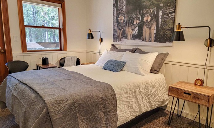 Welcome to our recently renovated Aspen queen bedroom at The Inn At Mazama, boasting bright, minimal decor. This is one of three identical Aspen rooms in the main lodge, perfect for solo guests or couples. Equipped with a fridge, microwave, and coffee maker, these ground-floor rooms have their own deck and garden access.